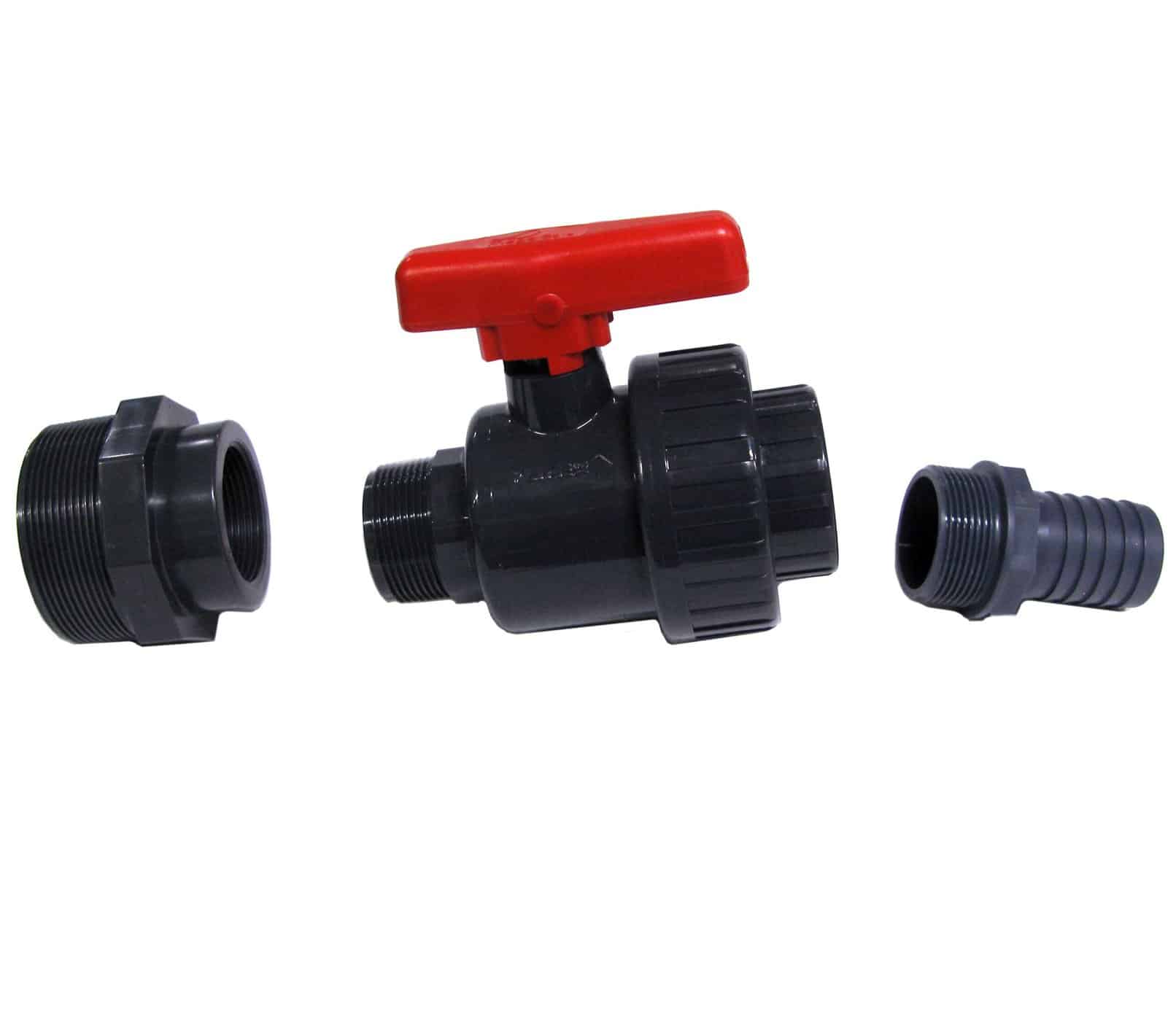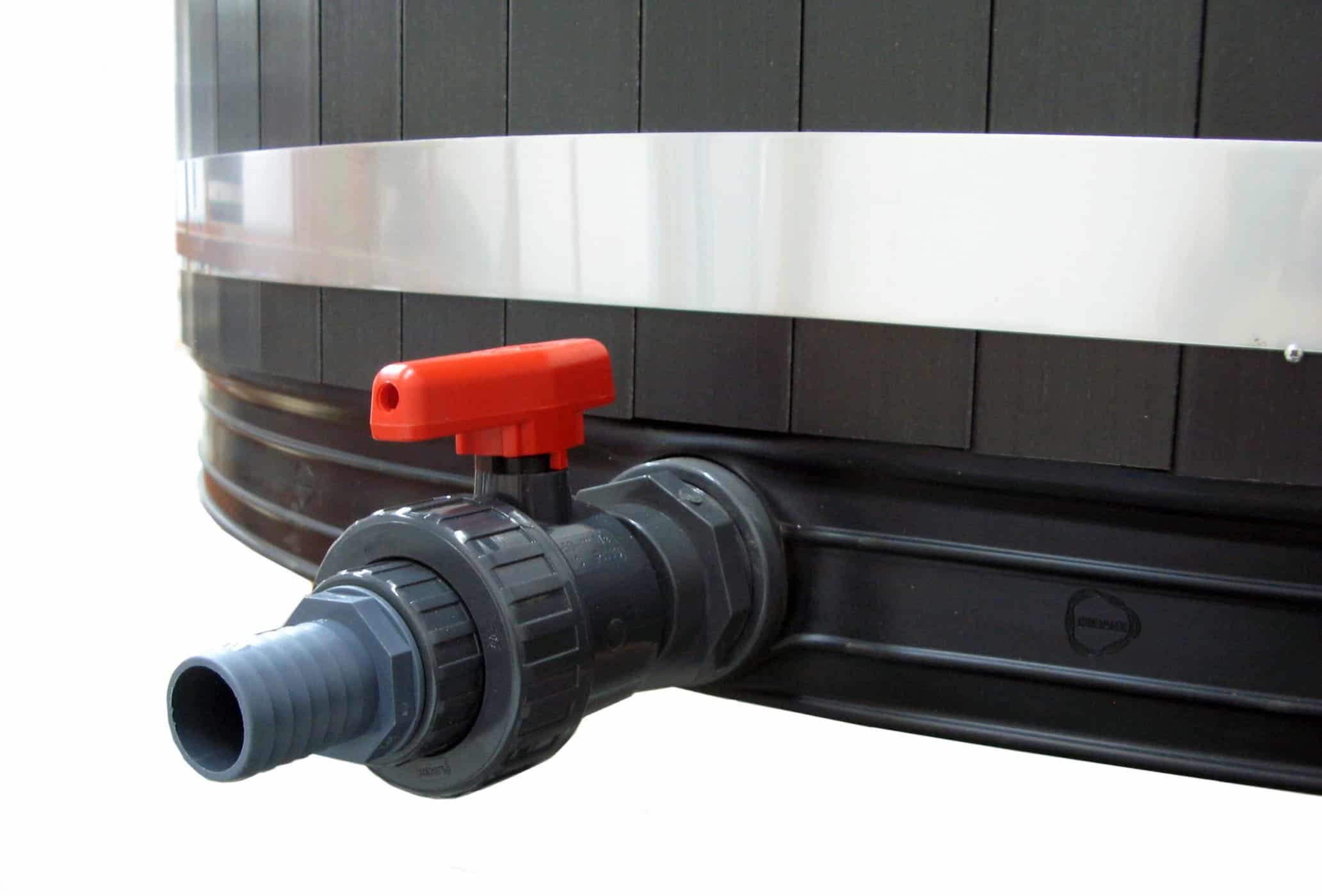 Das Set passt zu den meisten Kunststoff-Badefässern von Kirami, außer Tiny. Set, mit dessen Hilfe das Kirami-Ablassventil durch ein herkömmliches Kugelventil ersetzt werden kann.