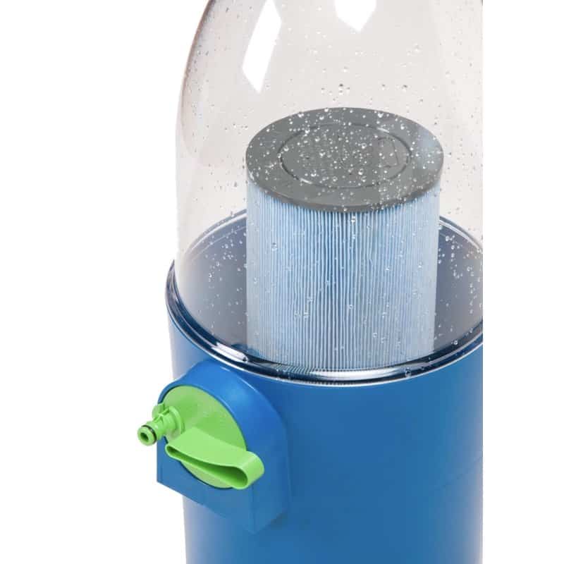 Sie setzen den Filter in die Vorrichtung ein, in der er gereinigt wird, und verbinden diese mit einem Wasserhahn; dann drehen Sie den Hahn auf. Der Filter ist innerhalb einer Minute wieder vollkommen sauber und fleckenlos – für mehr hygienischen Bade-Spaß!