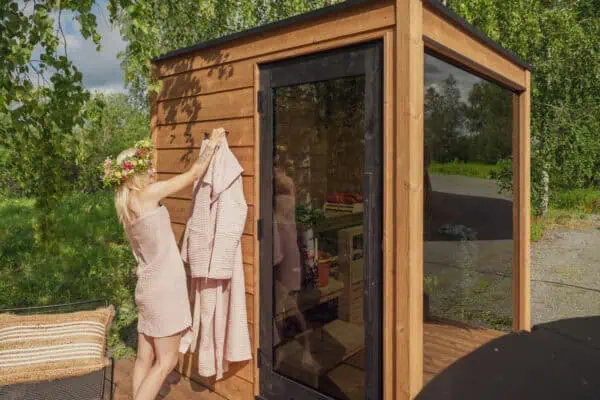 Die Außenverkleidung der Sauna wird aus witterungsbeständigen, wärmebehandelten Paneelen aus Kiefernholz gefertigt. Die Oberfläche der fertigen Außenverkleidung der Sauna kann so belassen werden, wie sie ist. Die Außenoberflächen werden im Laufe der Zeit eine schöne graue Patina bilden, wenn sie nicht behandelt werden.
