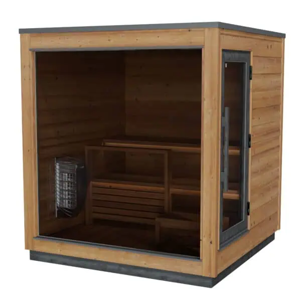Die vormontierte Kirami Sauna FinVision M Nordic Dawn ist eine gebrauchsfertige Außensauna für 4 – 6 Personen.