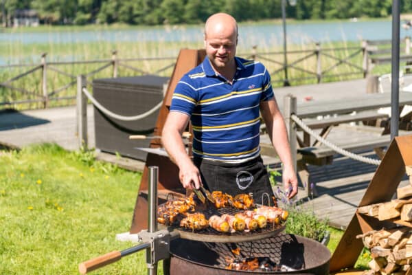Der Roasty Boss ist eine robuste Kreation, der auch die Wünsche anspruchsvoller Köche erfüllt. Der stabil auf Füßen aus rostfreiem Stahl stehende Grill verfügt standardmäßig über einen Grillrost, der sich in viele Richtungen einstellen lässt und einen oberen Grillrost zum Rösten, zum Grillen über offenem Feuer etc. Durchmesser des Gitters: ca. 70 cm. Endlich eine ausreichende Oberfläche, um für den gesamten Freundeskreis zu grillen, wobei die Kartoffeln nebenan im Kartoffeltopf garen! Der Grill bietet genug Platz, um eine hungrige Gesellschaft mit Essen zu versorgen und seine nutzerfreundliche Formgebung gestaltet die Zubereitung sehr angenehm.