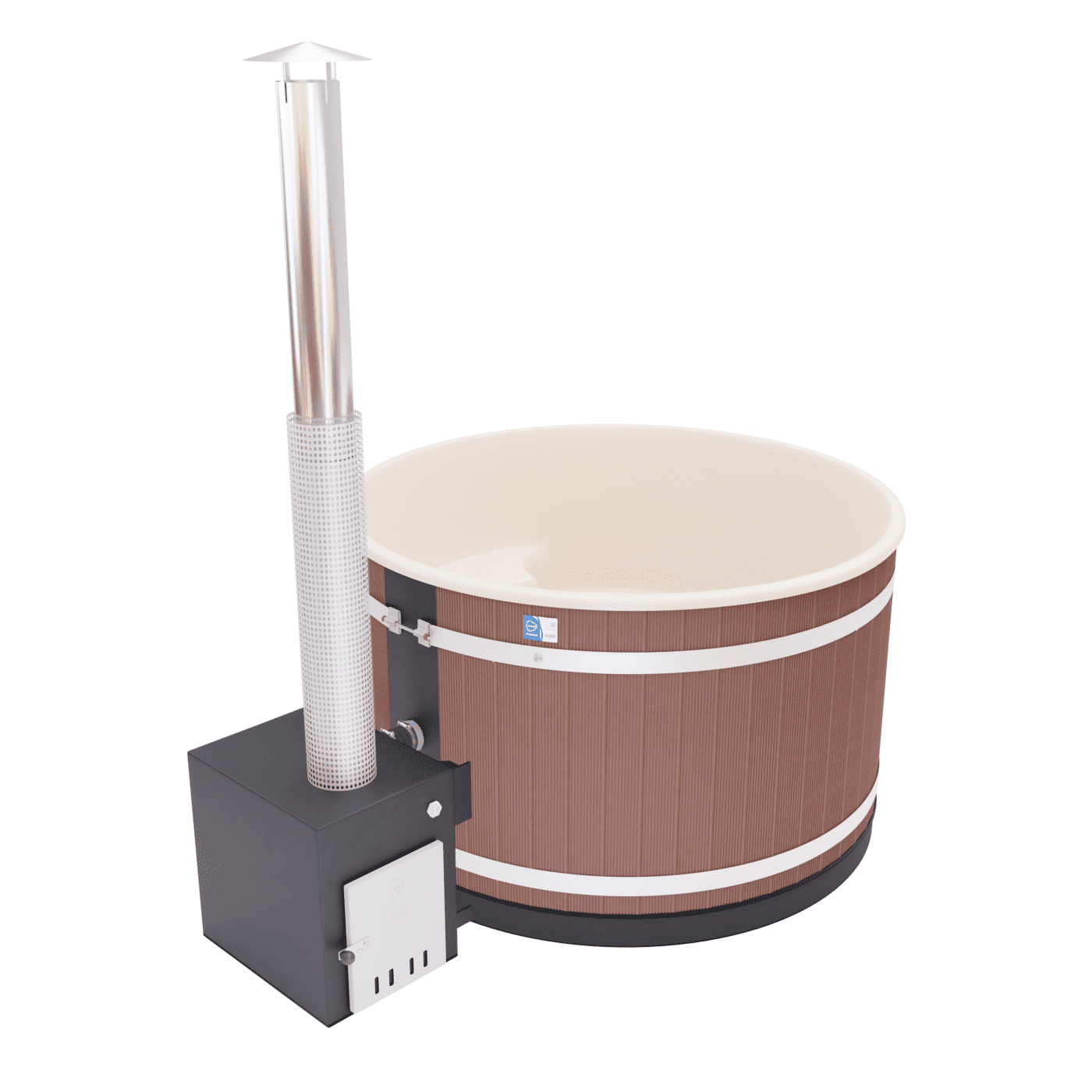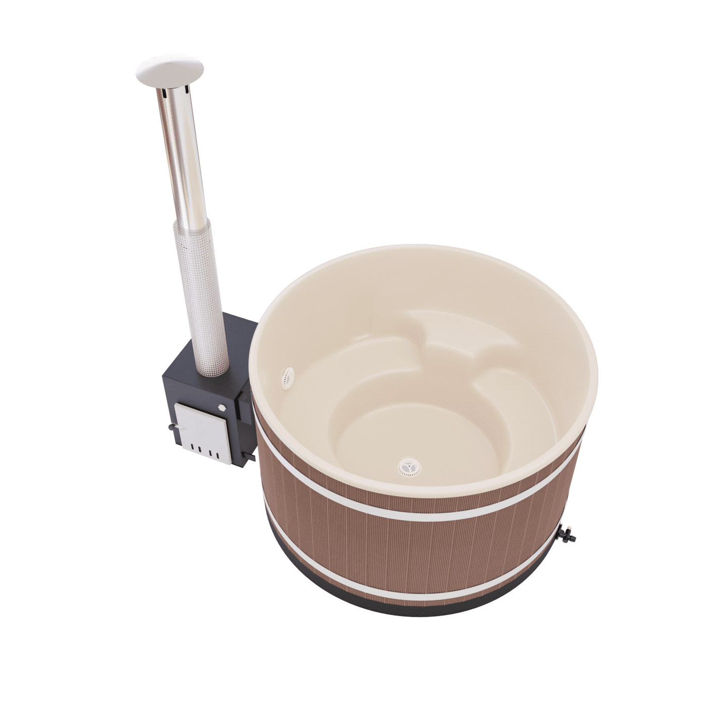 Als Außenofen kommt der schwarz gehaltene, leistungsfähige Cube zum Einsatz, der sich ideal zum Beheizen auch großer Badefässer eignet. Er wurde aus hochwertigem Meeresaluminium gefertigt, was eine äußerst gute Wärmeleitfähigkeit sicherstellt. Champagne ist eine klare und luxuriöse Wahl als Innenfarbe. Dieses elegante und fabelhafte Interieur garantiert unvergessliche und romantische Bademomente.