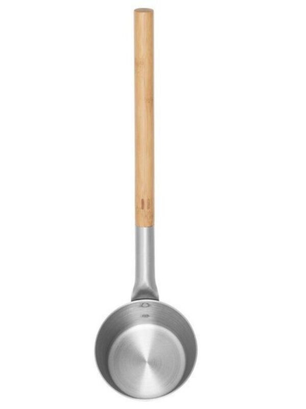 Die Kelle besteht aus robustem, eloxiertem Aluminium und einem Griff aus thermisch behandeltem Bambus. Diese Materialkombination ist besonders langlebig, leicht und optimal für das warme und feuchte Klima in der Sauna geeignet. Das Schöpfvolumen von etwa 4 dl ermöglicht eine angenehme Dosierung des Aufgusswassers.